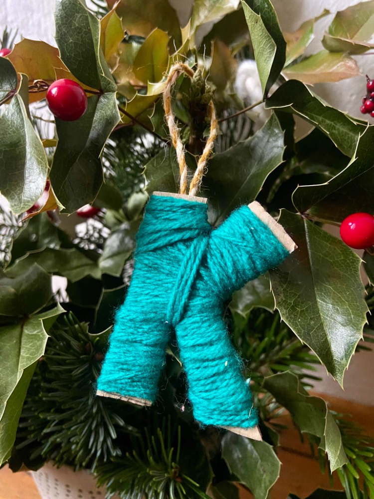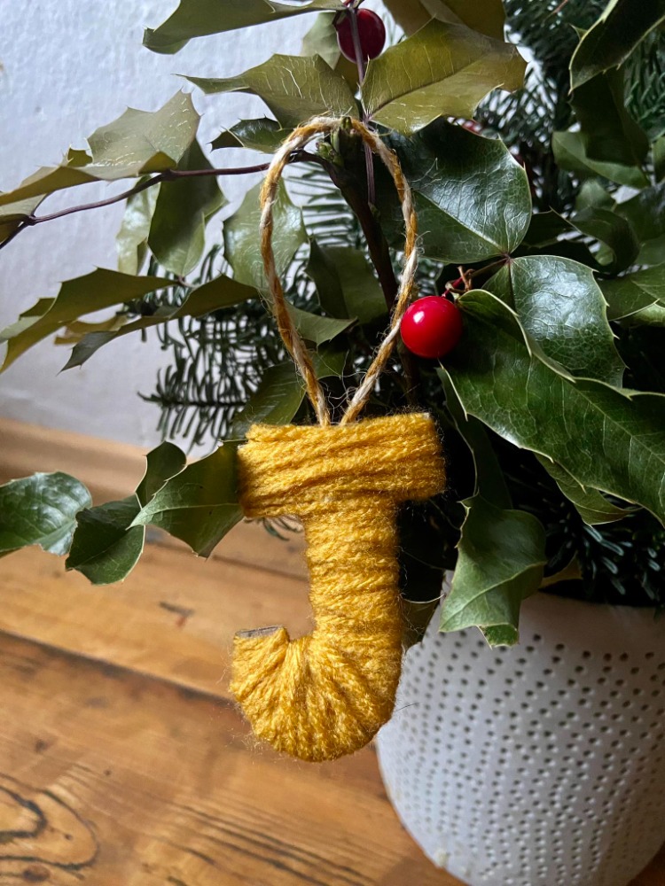 Na karton si nakreslíme začáteční písmeno svého jména a vystřihneme. Tavnou pistolí si přilepíme ustřižený provázek na karton, tak abychom vytvořili poutko a mohli písmenko kamkoliv zavěsit. Také přilepíme začátek bavlnky. Písmeno obmotáváme bavlnkou a utahujeme dokud karton nebude úplně celý schovaný.