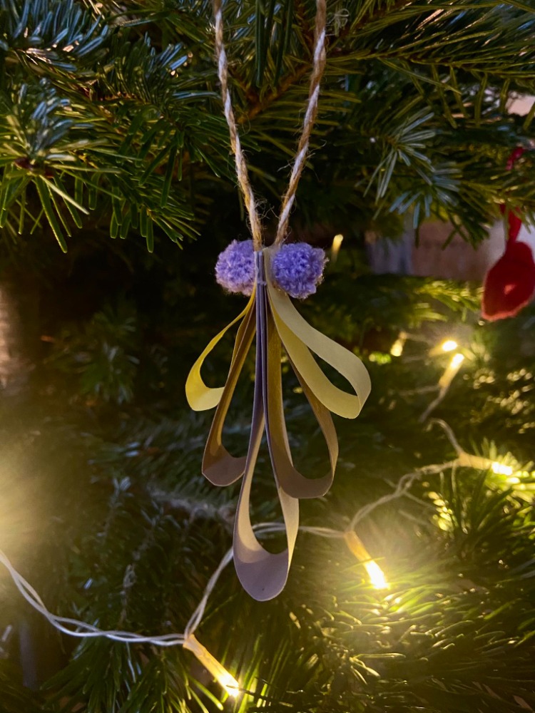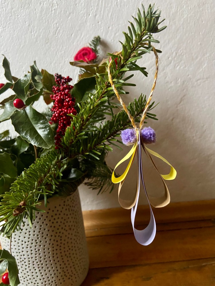 Z barevných papírů si vystřihneme přibližně 2 cm široké proužky, různě dlouhé. Lepidlem nebo tavnou pistolí slepíme konce proužků k sobě, aby nám vznikly „kapičky“. Kapičky pak slepujeme k sobě, jak se nám zalíbí. Stačí pak přilepit provázek na konce kapiček a na ozdobu ještě barevné kuličky.