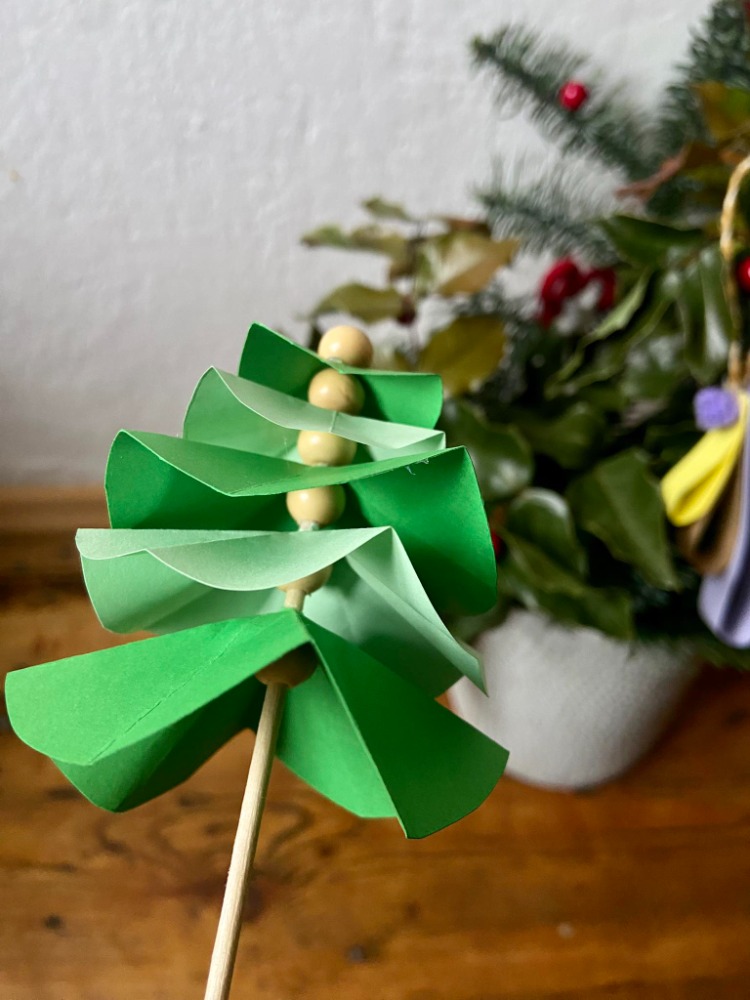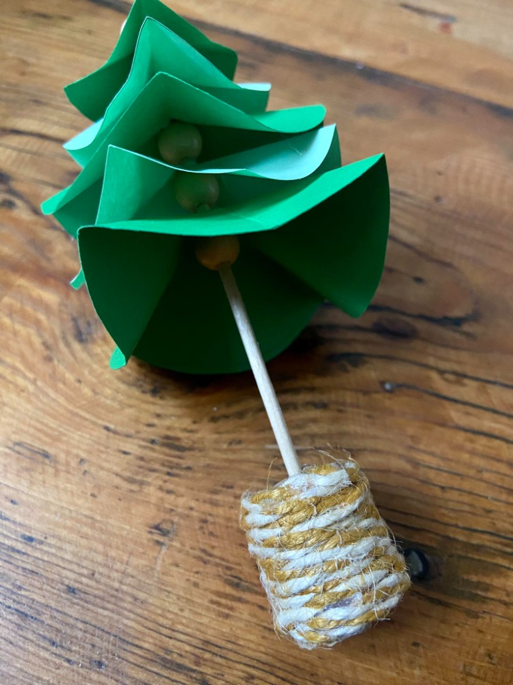 Pomocí kružítka si nakreslíme minimálně 5 kruhů od největšího po nejmenší. Potom je vystřihneme a přeložíme na osminky. Uprostřed uděláme nůžkami dírku. Nejprve provlékneme korálek na špejli a přiděláme tavnou pistolí, poté navlékneme největší kruh. Tak to pokračujeme střídáním korálku a papírového kruhu (od největšího po nejmenší) až skončíme korálkem. Zbytek špejle zastřihneme. Korek přeřízneme na půl, aby nám hezky stál na stole a provázkem ho obtočíme (pomůžeme si tavnou pistolí, začátek provázku připevníme ke korku). Nožem nebo nůžkami uděláme dírku do vršku korku, kam zapíchneme špejli.