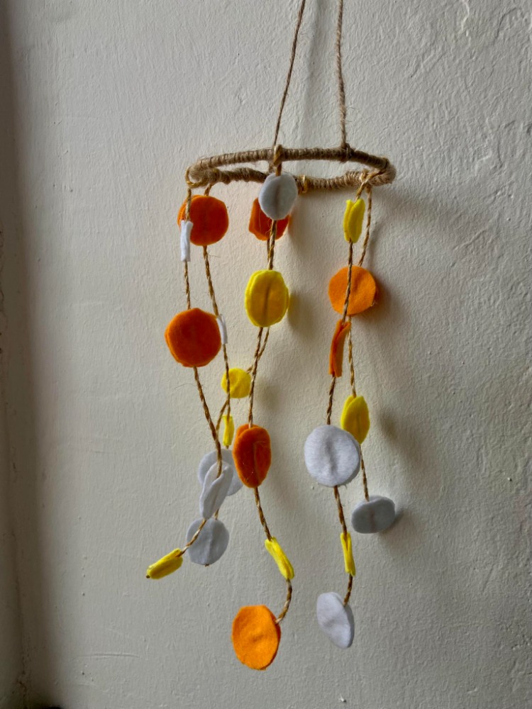 Postup: Nejprve si uděláme z papíru šablonu kruhu. Nemusíme mít pouze jednu velikost. Z různě barevných plstí si vystřihneme kruhy po dvojicích. Na ozdobný provázek pomocí tavné pistole nalepíme jeden kruh a zakryjeme ho druhým kruhem. Z drátku si uděláme kruh, který obmotáme provázkem a na něj uvážeme provázky s barevnými kruhy, následně zavěsíme.