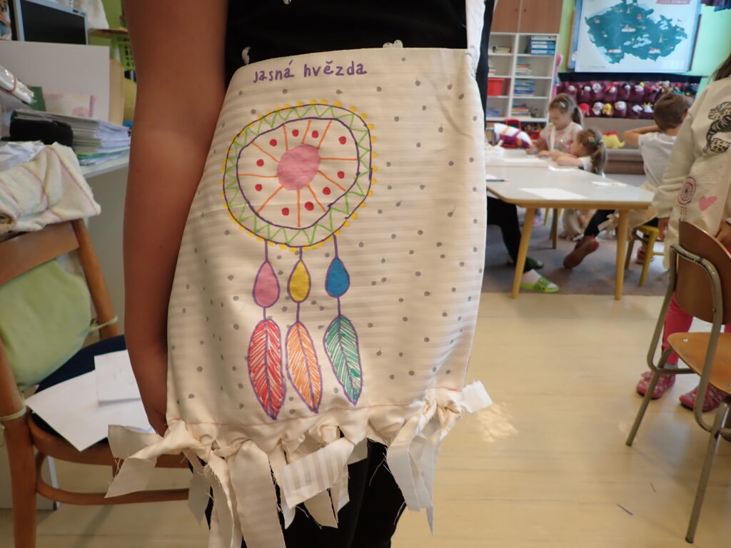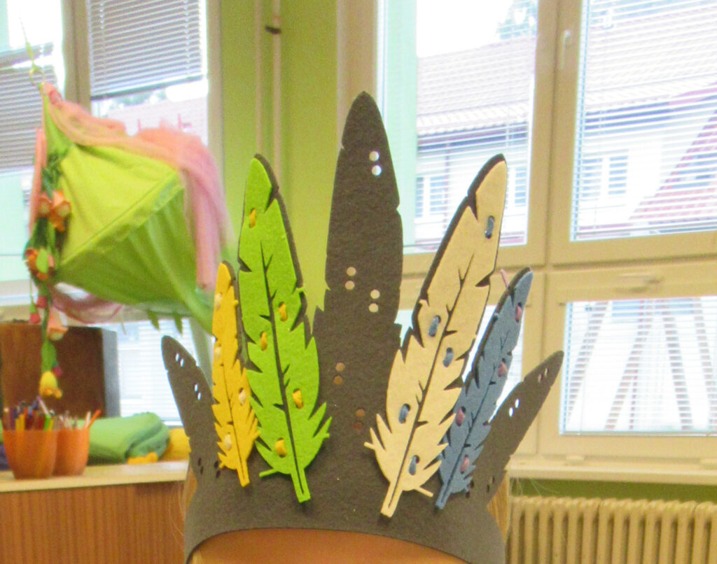 Pokud máte dostatek financí, doporučuji také zakoupit indiánské čelenky z filcu, které mají perforované díly – čelenku a ptačí péra ( také filcová, různobarevná). Děti se první den naučí péra přišít. Přiloženou tenkou filcovou barevnou šňůrkou předním stehem provlékají péro přes perforované body v čelence – zvládli to i předškoláci. Podle zásluh pak během bloku mohou dostávat různě barevná péra.