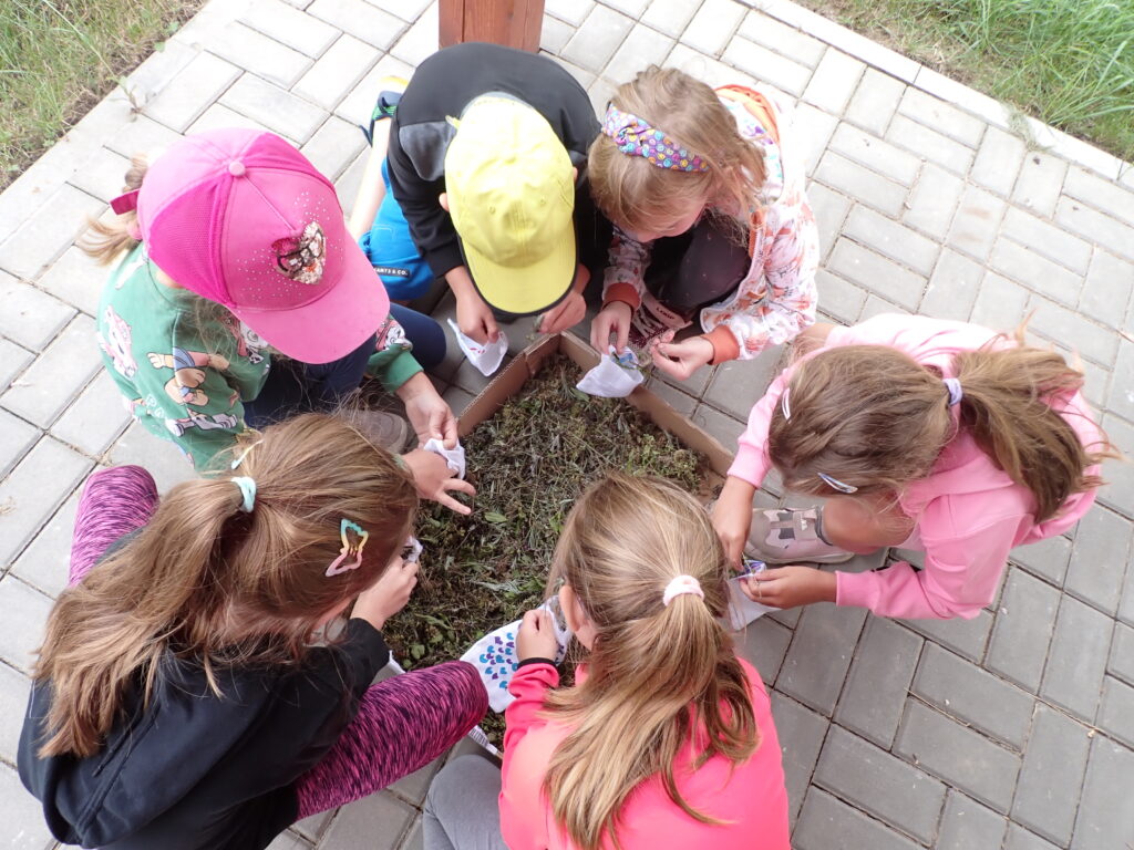 Máte bylinkovou zahrádku? Nasbírejte společně voňavé bylinky. My jsme použili mátu, mateřídoušku, meduňku, levanduli a tymián. Stonky rostlin jsme nastříhali na menší kousky. Než vyrobíme pytlíček, bylinky se nám na vhodném místě usuší.