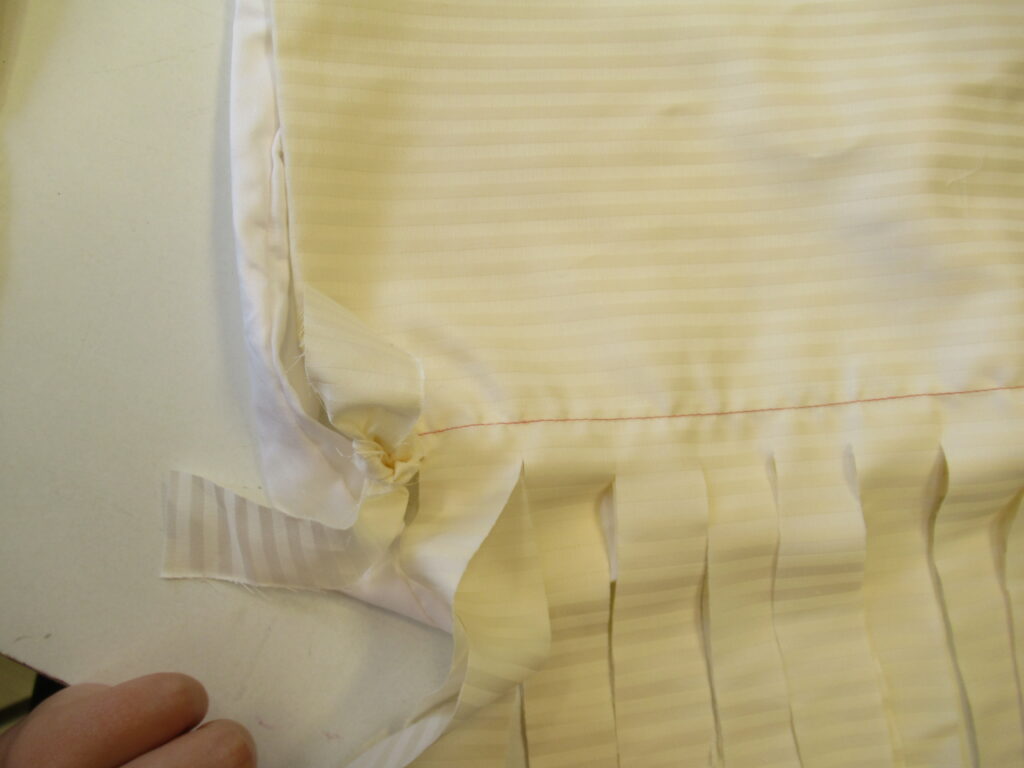 Díly jsem podélně sešila a do spodní části ke spoji přišila kapsu velkou tak, aby se dal zasunout kůl ze základny. Spodní okraj stanu jsem přešila prostým založením a horní okraj začistila širším přešitím, abych pak do okraje navlékla provázek nebo gumu na stažení.