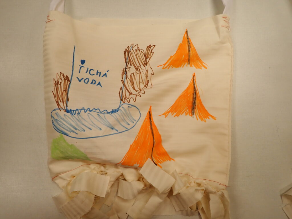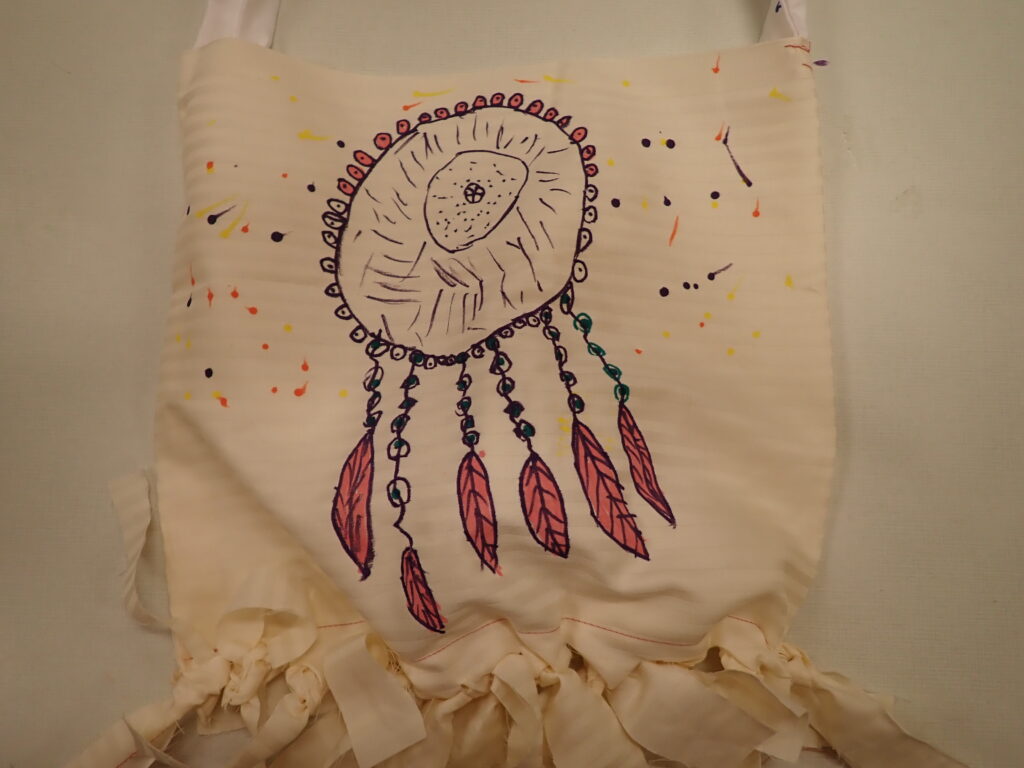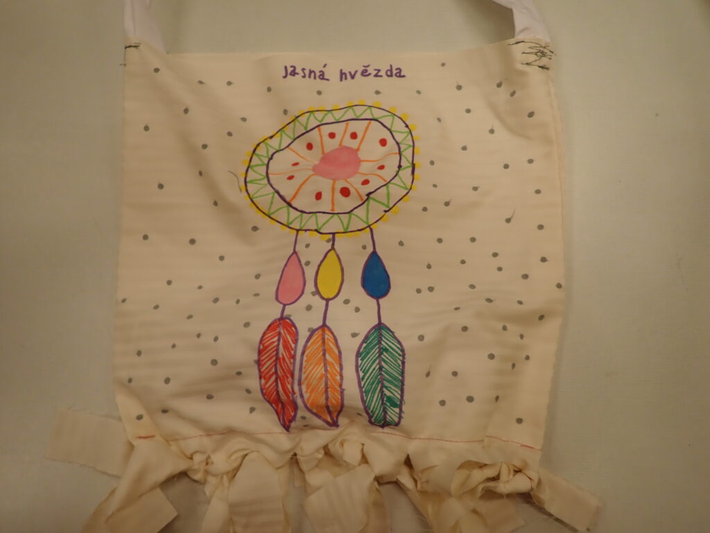 Ze zbytků bavlněného plátna ušijeme jednoduchou tašku s uchem. Indiánskou se stane tak, že dno tašky nesešijeme až na konci obdélníku, ale asi 10cm od okraje. Nastříháním tohoto velkého okraje na proužky vzniknou třásně – zauzlujeme vrchní a spodní třáseň k sobě. Na obrázku je to dobře vidět. Tašku můžeme i nabatikovat známou metodou.