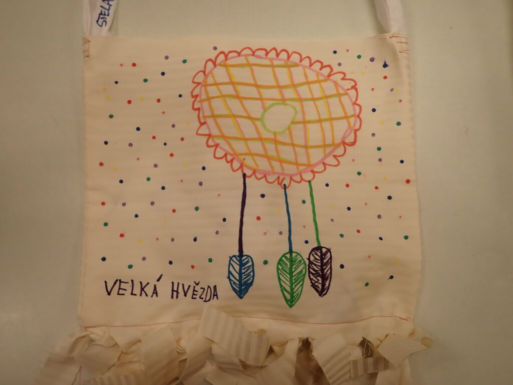 Na bílé nebo přírodní plátno rozkreslíme návrh vlajky a tónovacími barvami vybarvíme. Zavěsíme do prostoru k totemu.