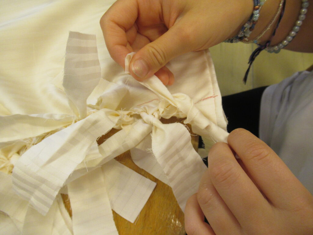 Po začištění krajů jsem vložila kůly do našitých kapes – zevnitř, natáhla plachtu stanu, abych měla sešitou stranu přiloženou ke dřevu boční hrany, upravila napětí a zajistila horní stažení provlečenou gumou nebo provázkem, aby byly strany stanu rovnoměrně rozděleny. Provrtali jsme kůl i látku a pevně spojili opět k sobě stahovací páskou. Kůly jsme rozevřeli, jeden z dílů rozstřihli uprostřed jako vchod a tee pee bylo hotovo.