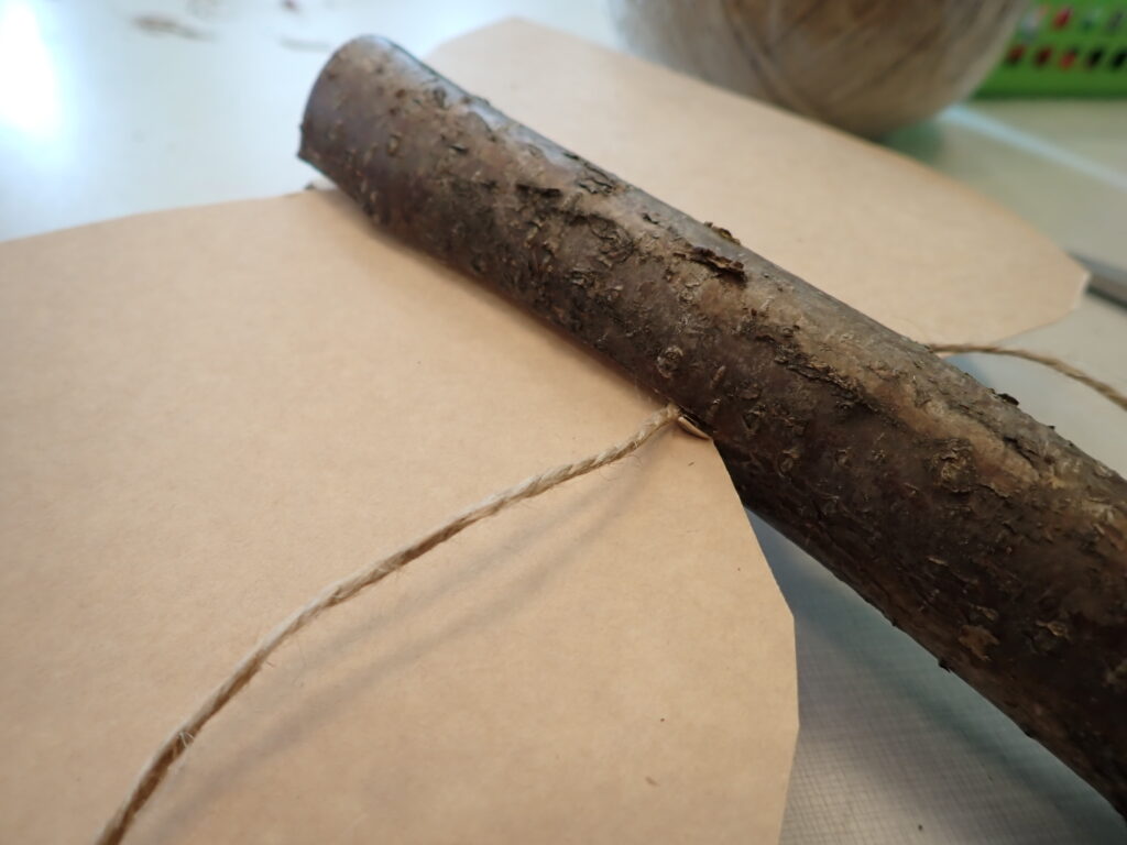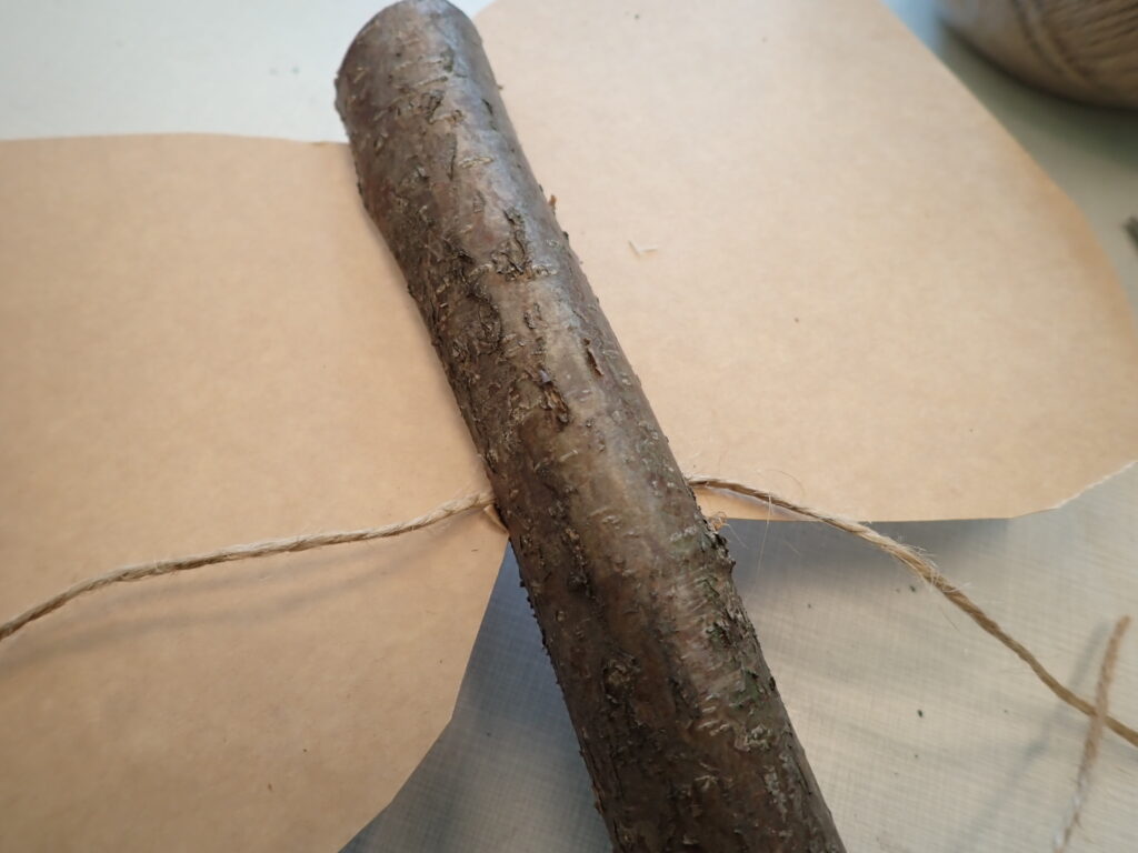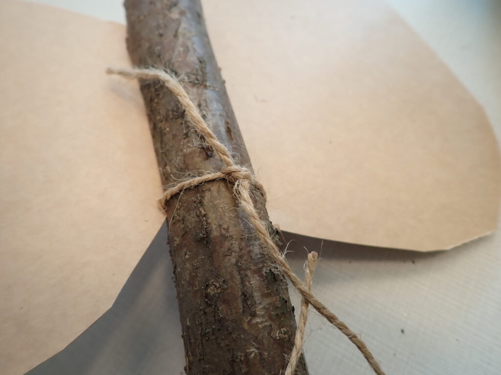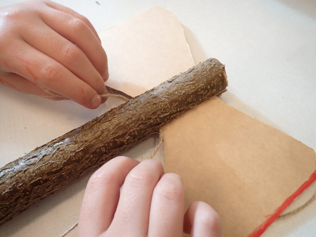 Ostří jsme pak vložili do zářezu a spolu s ním i provázek asi 1 metr dlouhý. Jeden konec jsme nechali u zářezu asi 8cm volný, druhým delším koncem omotávali ostří do kříže tak, aby v topůrku drželo. Oba konce provázku jsme pak pevně zauzlíkovali.