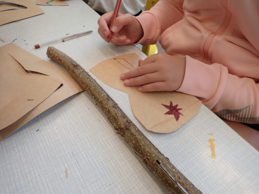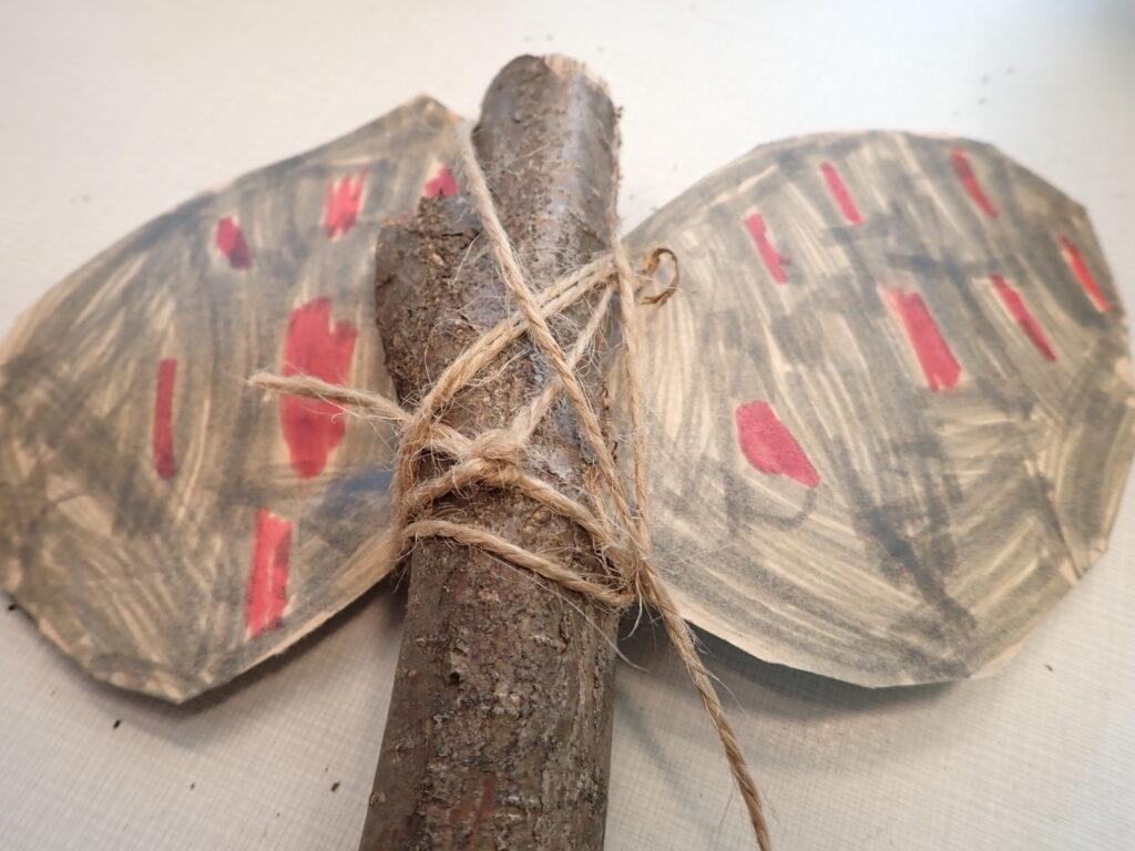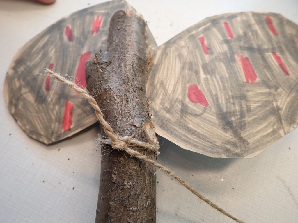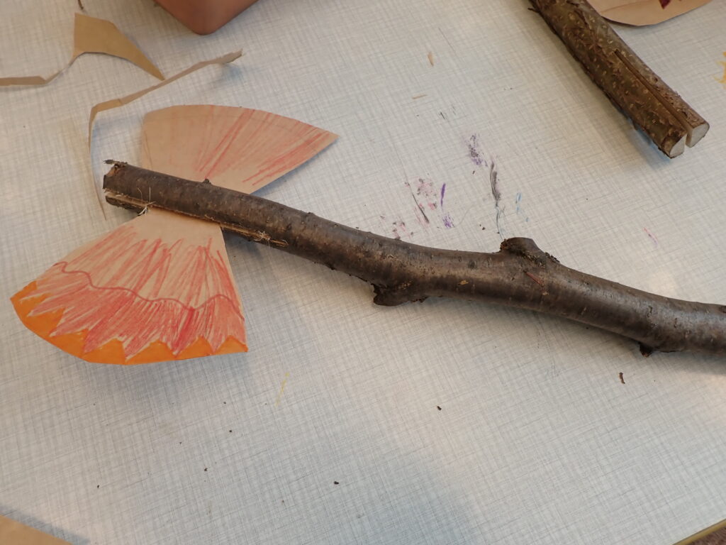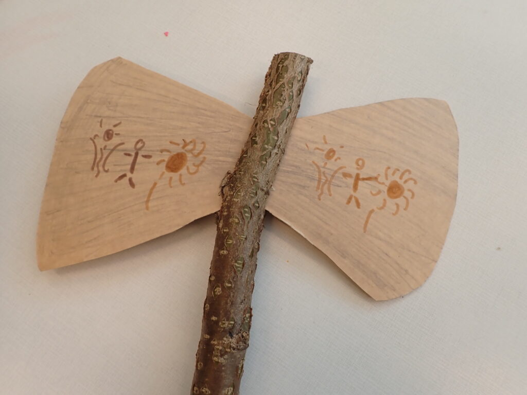 Potřebujeme tyčky – topůrka délky cca 30 – 40cm, použili jsme opět lískové pruty s průměrem asi 4cm, do kterých nám šikovný kutil nařezal podélné zářezy asi 7cm. Na přírodní karton nebo opravdu pevný papír jsme předkreslili tvar sekyrky, holkám připomínal velkou mašli. Vystřihli jsme, vložili do zářezu, upravili zastřižením přesahujících okrajů. Opět jsme pokreslili indiánskými vzory nebo svými motivy.