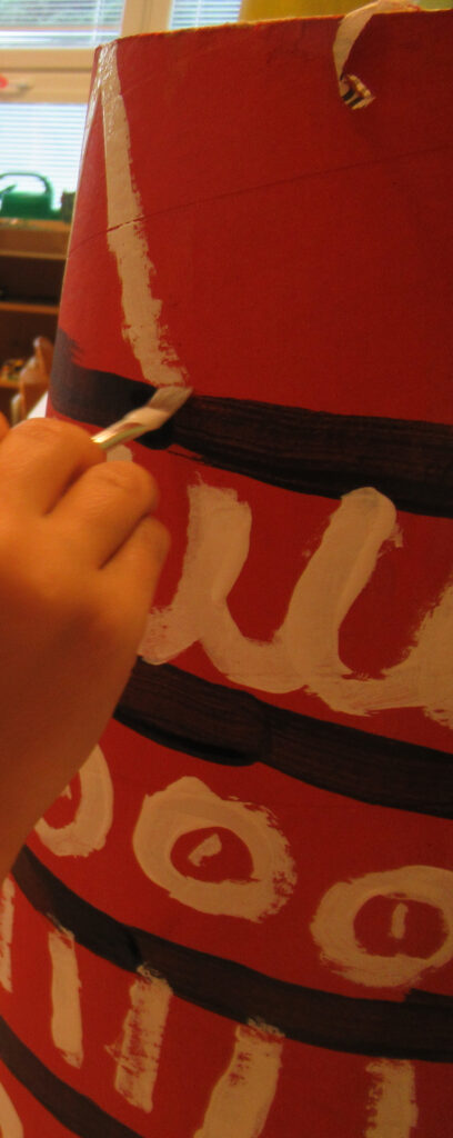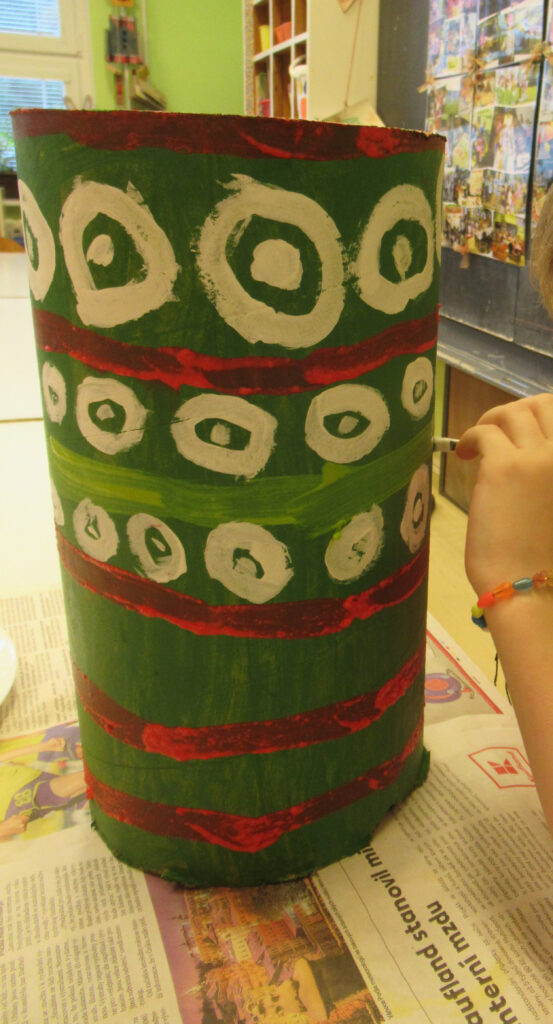 Kůl zasuneme do otvoru a sestavíme totem, mezi jednotlivými díly prokládáme nastříhaný kulatý karton. Totem vymalujeme tónovacími barvami a dbáme na to, aby opravdu každý maloval kousek. Protože jen tak bude mít opravdu mocnou sílu a všechna rokování kmene dostanou posvátnou atmosféru.