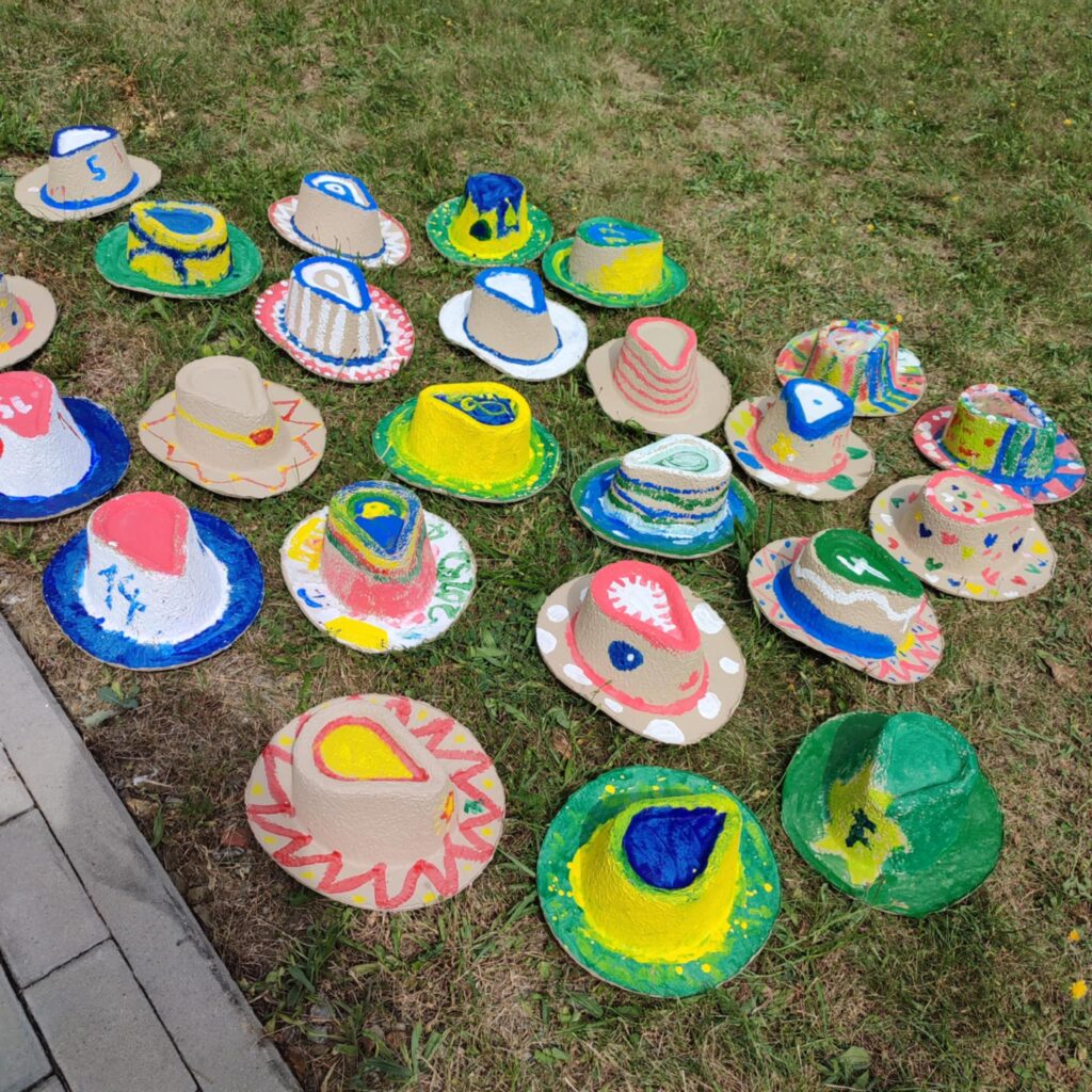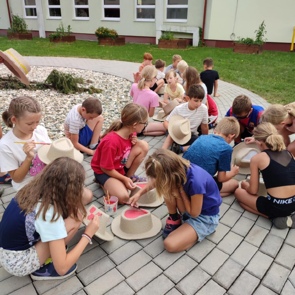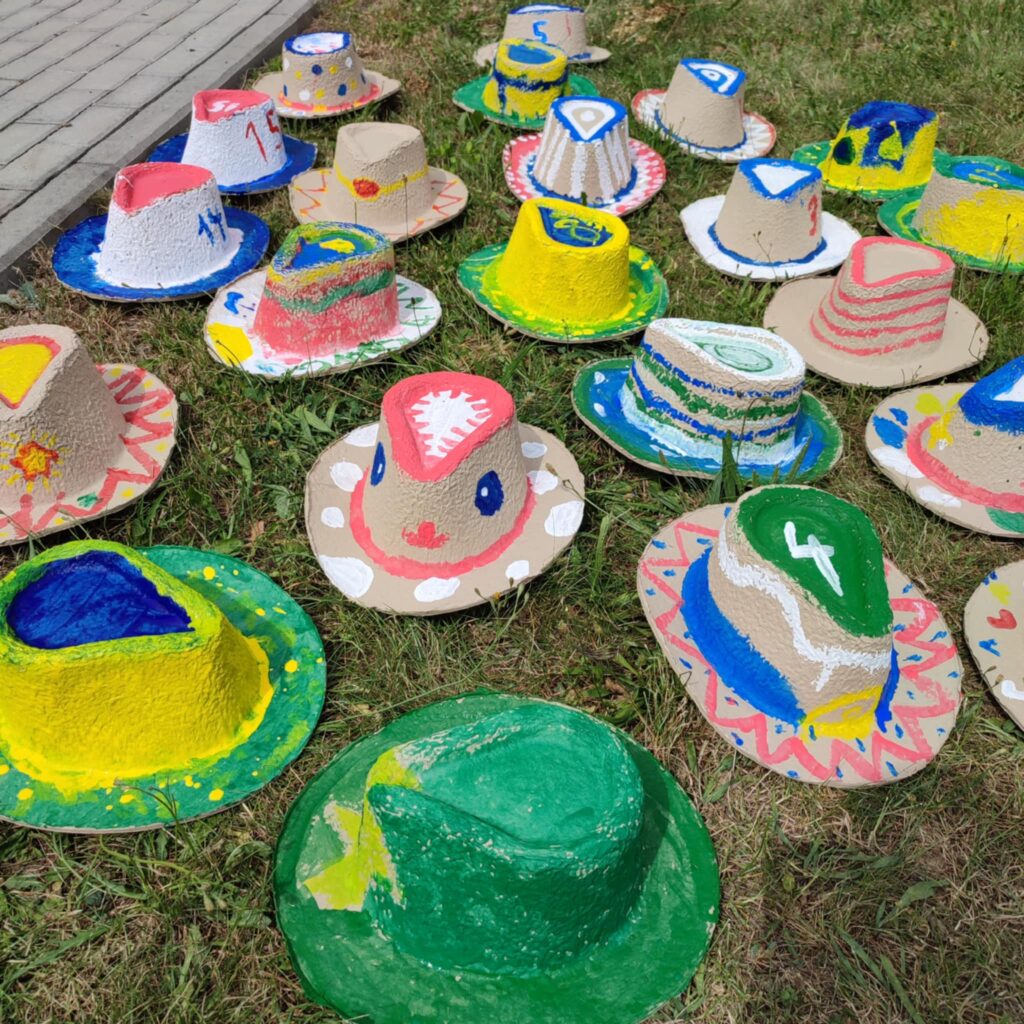 Na táboře si je děti nabatikovaly známou technikou svazováním látky. Šátky modře, aby ladily k džínovým sukním, vesty hnědé, aby byly skoro jako opravdové kožené. Tak jsme celou skupinu táborníků sjednotili do country kostýmů. Abychom byli jako opravdoví honáci, dostali všichni ještě i klobouky z kartonáže, které si vybarvili podle svého.