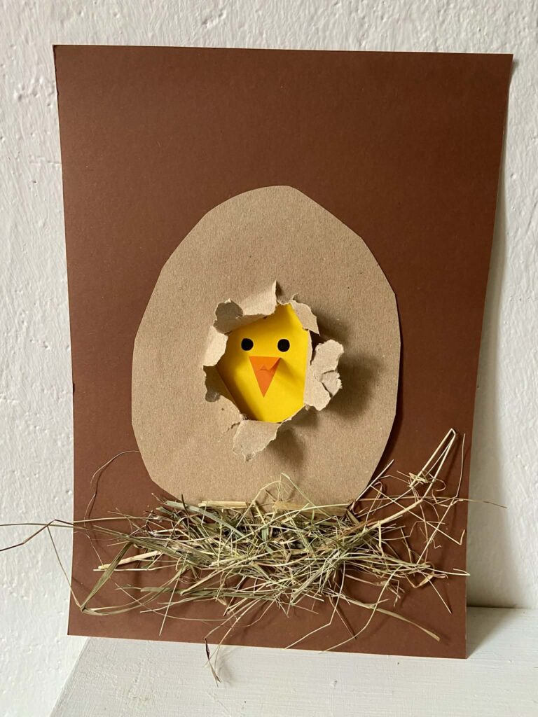 Kuřátko přilepíme na hnědou čtvrtku a přes něj nalepíme vajíčko tak, aby z něj vykukovalo. Nakonec dole vytvoříme hnízdo ze sena nebo nastříhaného papíru.