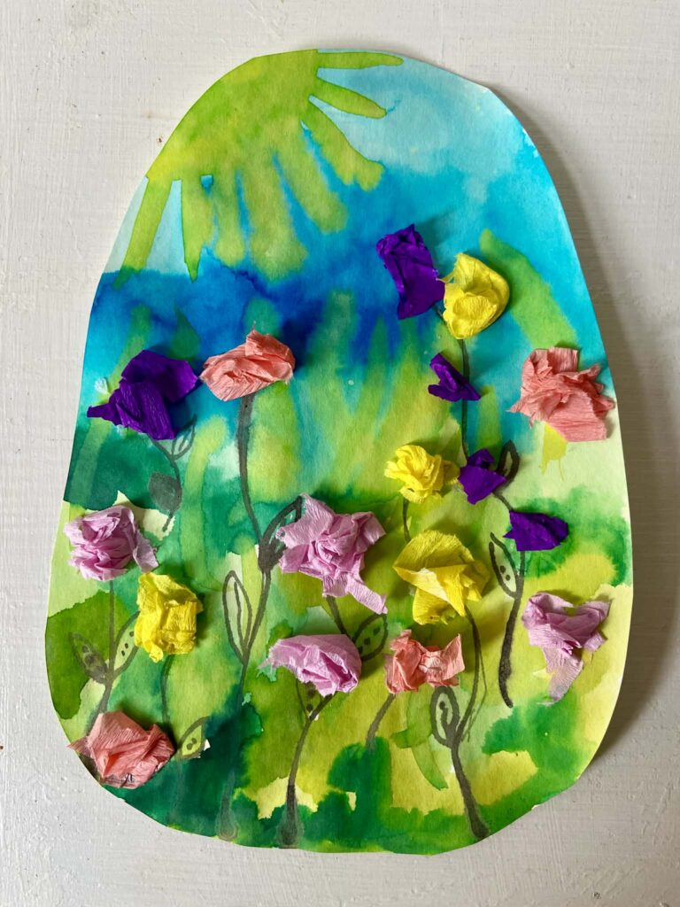 Z papíru vystřihneme tvar kraslice a pomocí tuše nakreslíme stonky květin. Po zaschnutí vybarvíme pozadí – použijeme zelené odstíny pro louku a modrou pro nebe. Barvy necháme volně rozpíjet, aby vznikl zajímavý efekt.