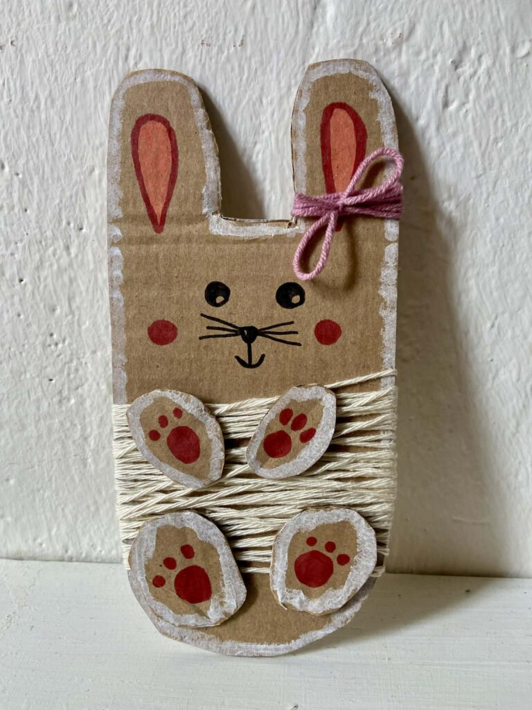Z kartonu vystřihneme také malé části – tlapky. Tělo zajíčka omotáme bavlnkou kolem bříška. Na ni poté nalepíme tlapky (nejlépe tavnou pistolí).